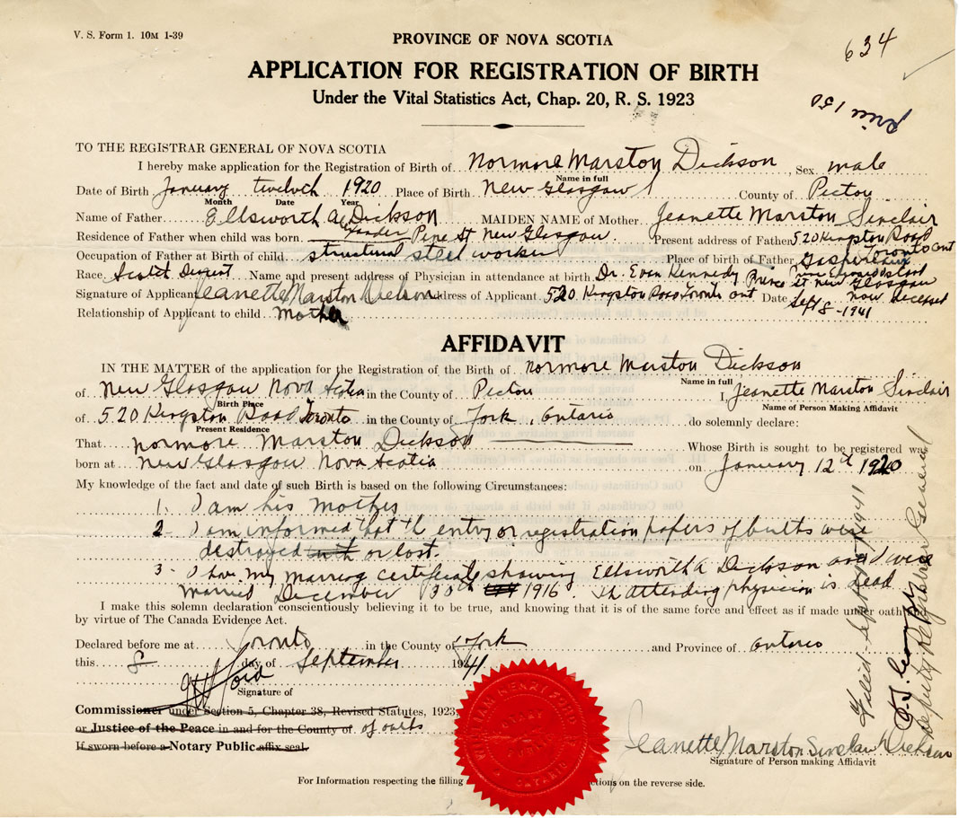 Date of Birth January 12, 1920 Place of Birth New GlasgowCounty of Pictou