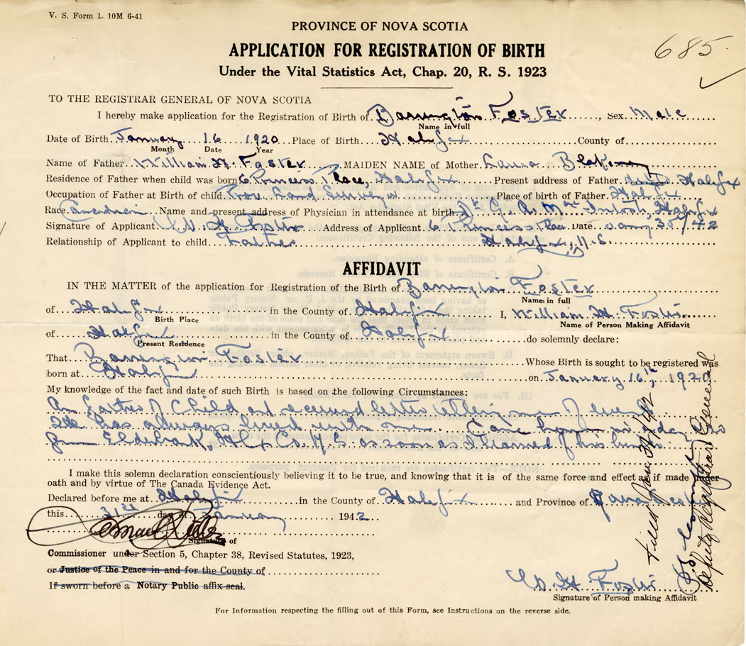 Signature of Applicant William H. Foster Address of Applicant Halifax Date January 30, 1942