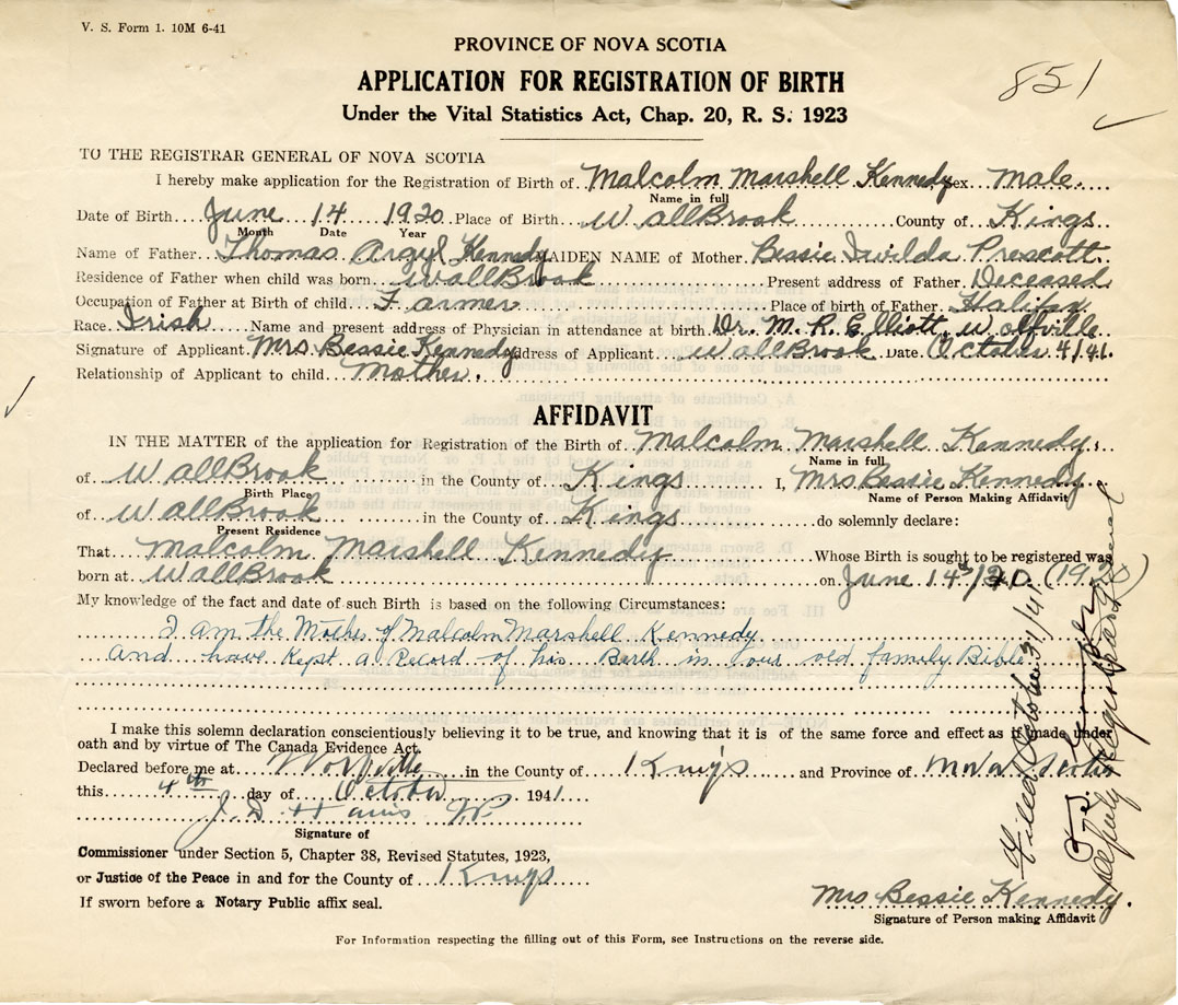 I am the mother of Malcolm Marshall Kennedy and have kept a record of this Birth in our old family Bible