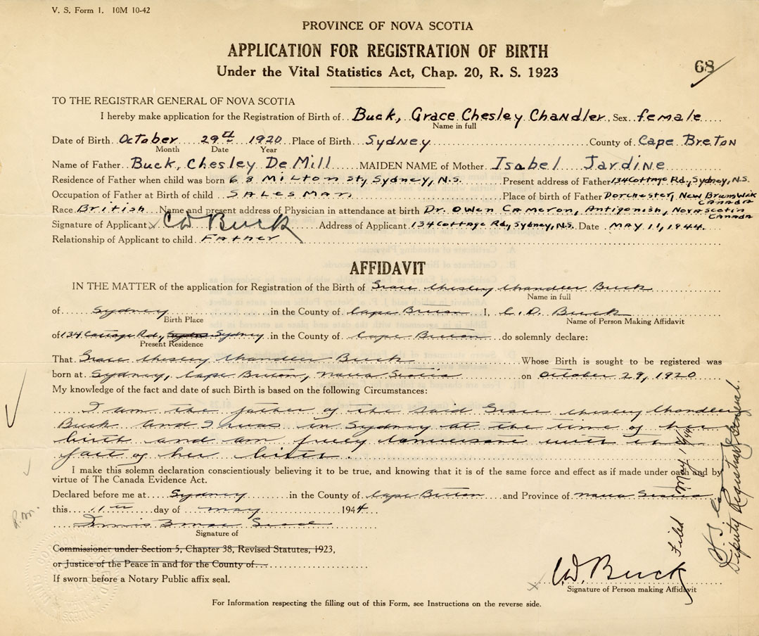 IN THE MATTER of the application for the Registration of the Birth of Grace Chesley ChandlerBuck