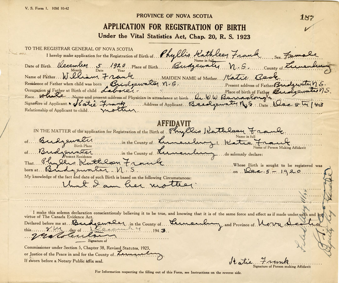 Date of Birth December 5, 1920 Place of Birth BridgewaterCounty of Lunenburg