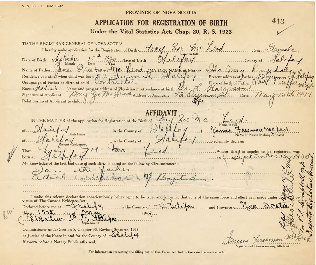 Signature of Applicant May Zoe McLeod [James Freeman McLeod] Address of Applicant Halifax Date May 15, 1944