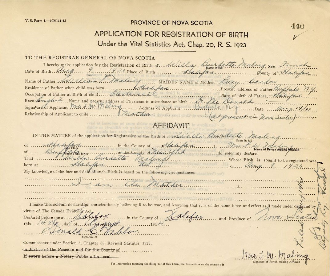 IN THE MATTER of the application for the Registration of the Birth of Willa BurdetteMaling