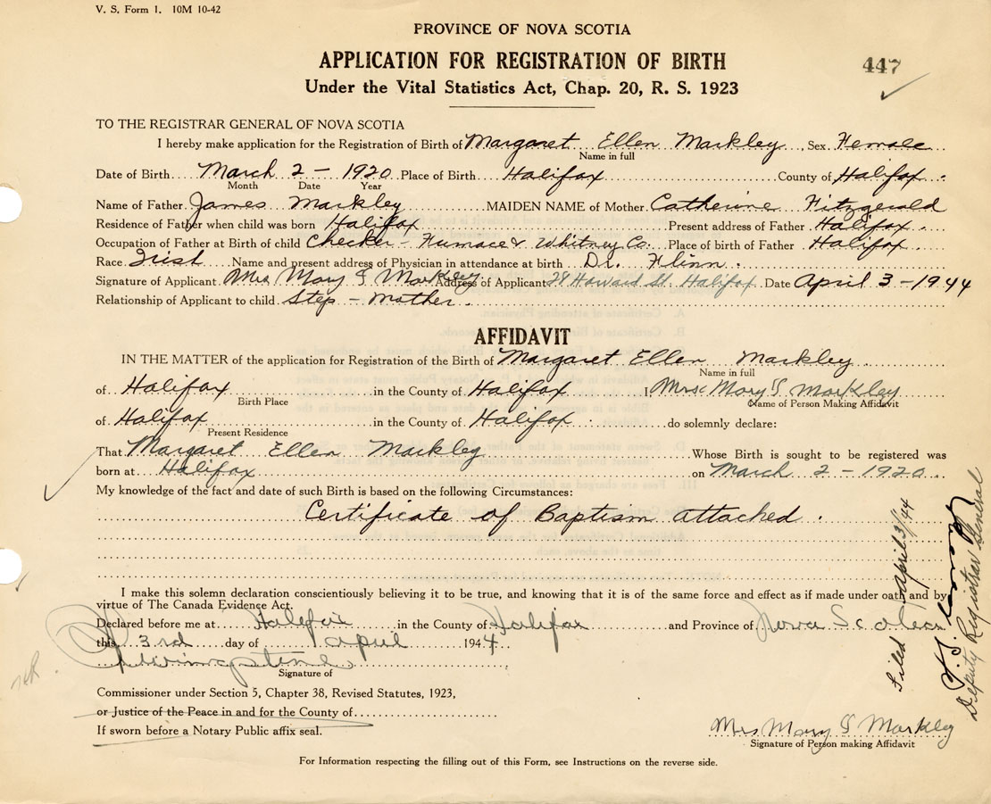 Signature of Applicant Mary J. Markley Address of Applicant Halifax Date 3 April 1944