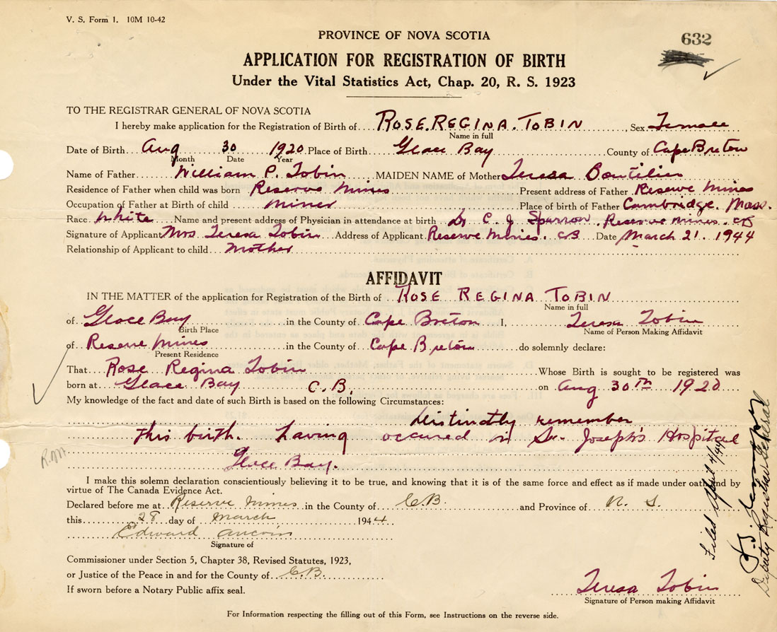 I hereby make application for the Registration of Birth of Rose ReginaTobin Sex Female