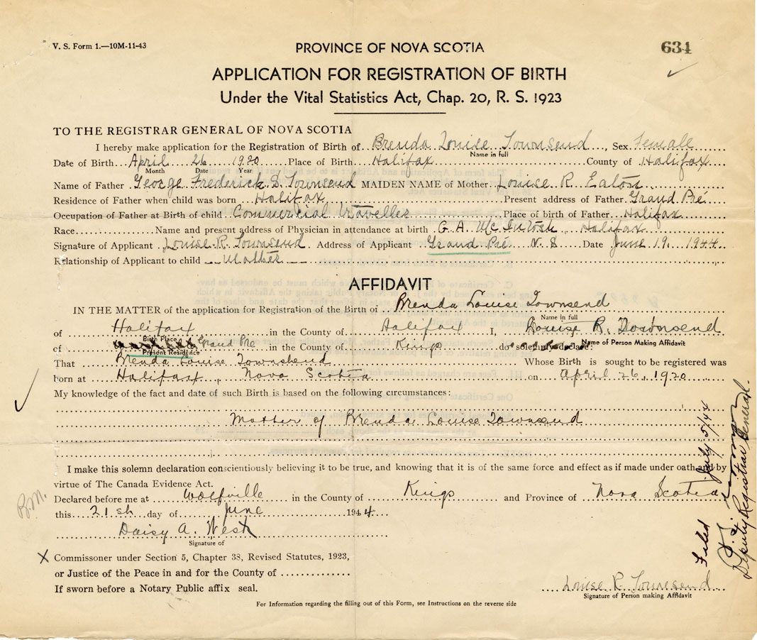 Signature of Applicant Louise R. Townsend Address of Applicant Grand Pre, Kings Co. Date 19 June 1944