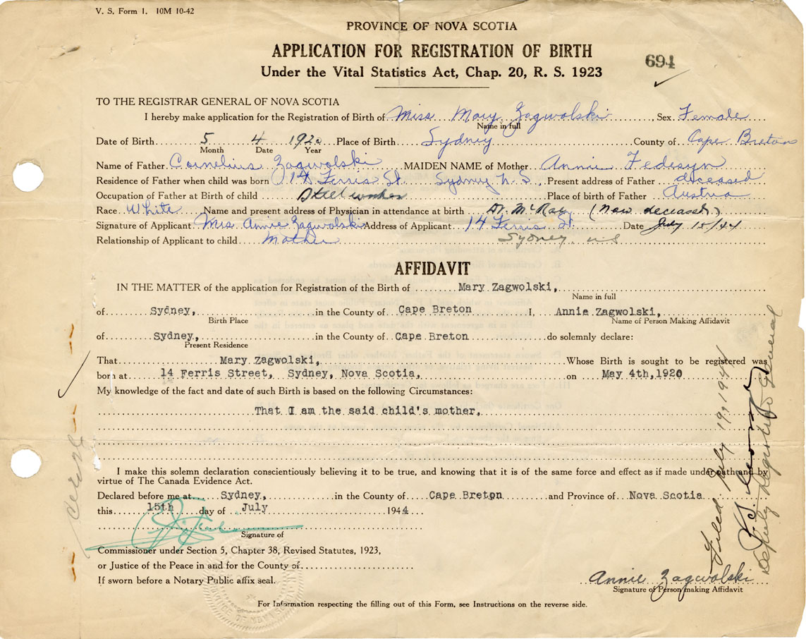 IN THE MATTER of the application for the Registration of the Birth of MaryZagwolski