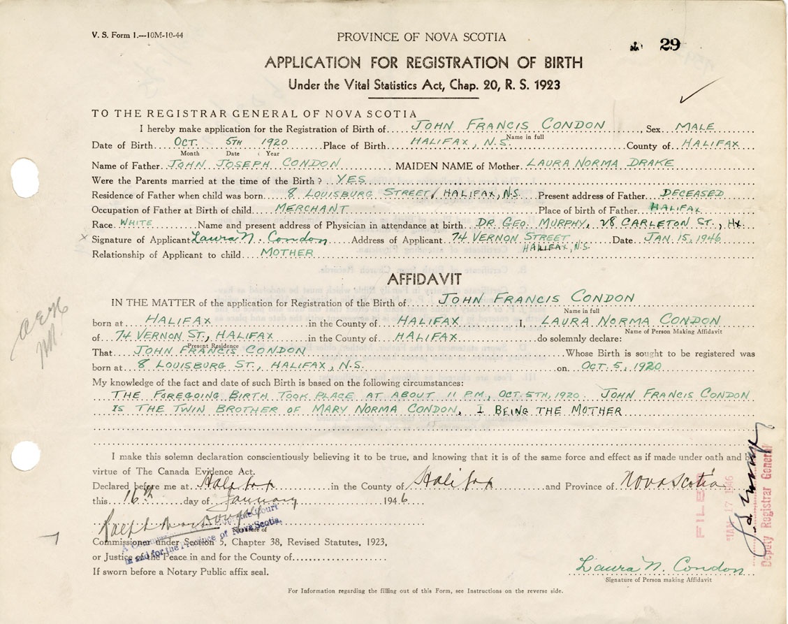 The foregoing birth took place at about 11pm on October 5, 1920. John Francis Condon is the twin brother of Mary Norma Condon, I being the mother.