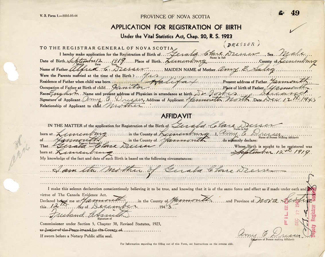 IN THE MATTER of the application for the Registration of the Birth of Gerald ClareDresser