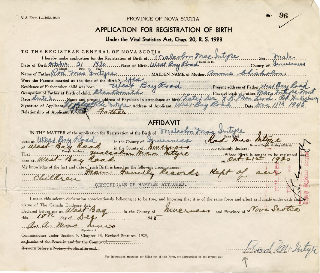 Signature of Applicant Rod MacIntyre Address of Applicant West Bay Road, Inverness Co. Date 11 December 1945