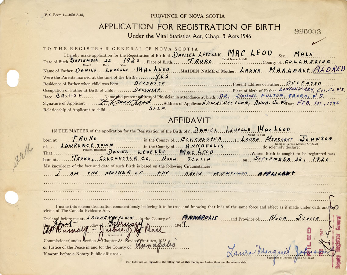 IN THE MATTER of the application for the Registration of the Birth of Daniel LevelleMacLeod