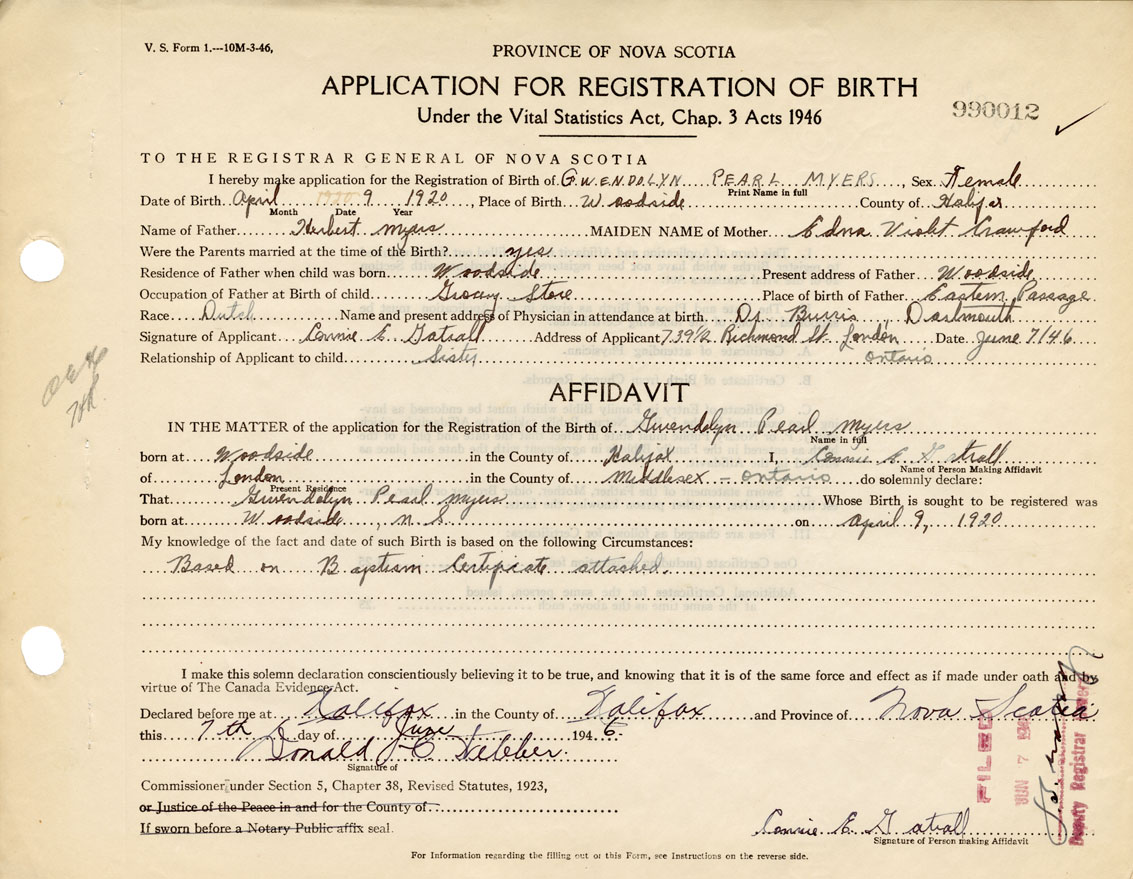 I hereby make application for the Registration of Birth of Gwendolyn PearlMyers Sex Female