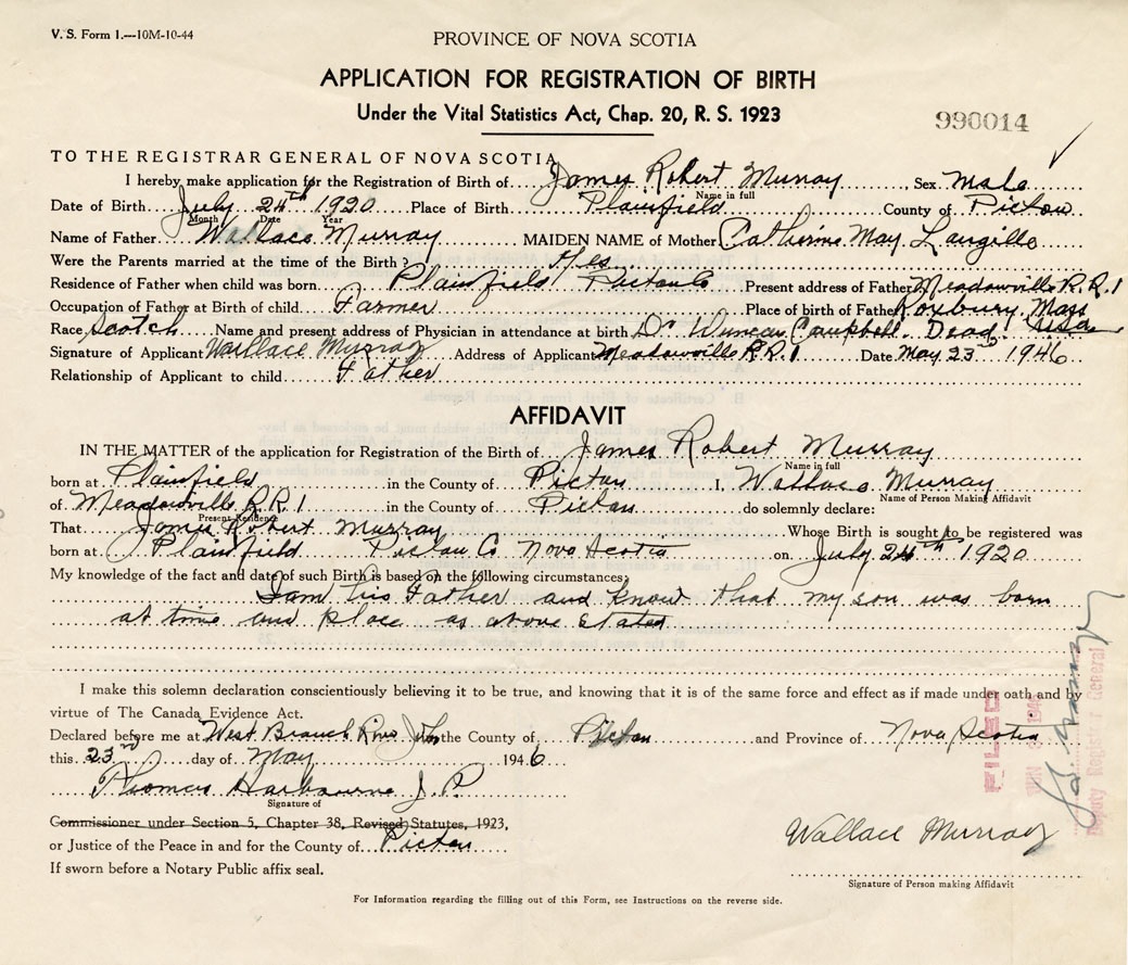 Date of Birth July 24, 1920 Place of Birth PlainsfieldCounty of Pictou