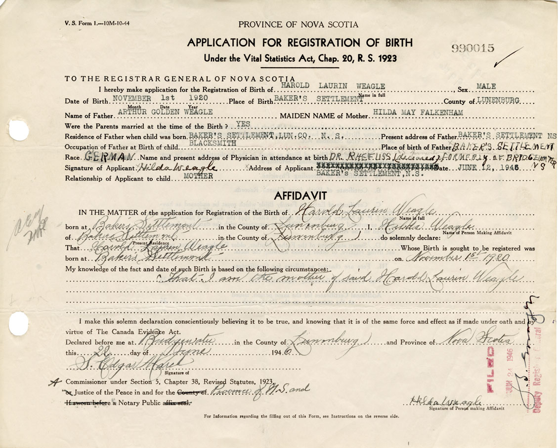 I hereby make application for the Registration of Birth of Harold LaurinWeagle Sex Male