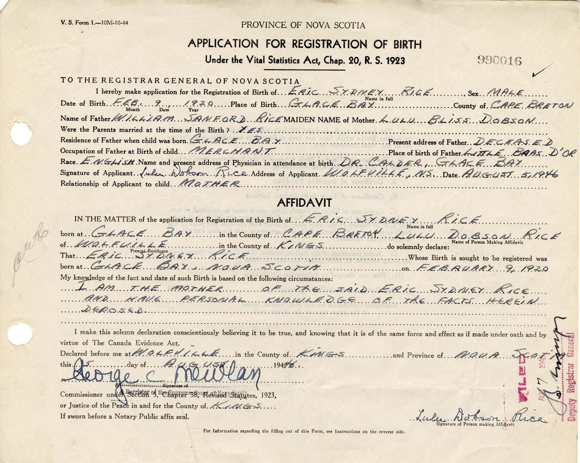 I hereby make application for the Registration of Birth of Eric SydneyRice Sex Male