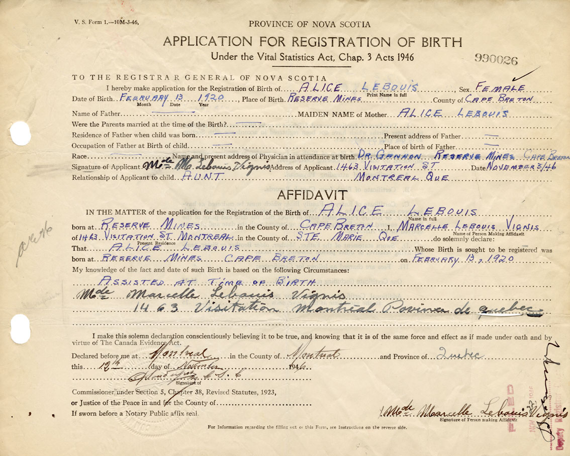 I hereby make application for the Registration of Birth of AliceLebouis Sex Female
