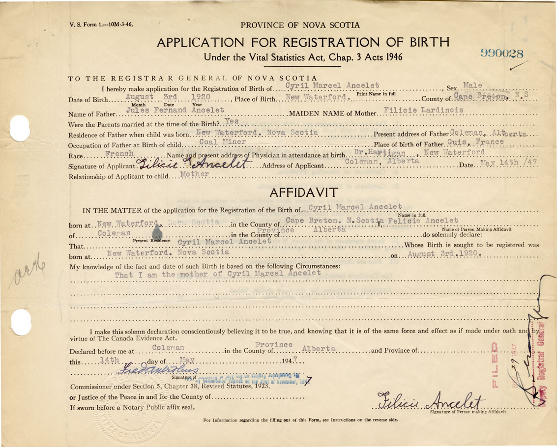 Signature of Applicant Filicie Ancelet Address of Applicant Coleman, Alberta Date May 14, 1947