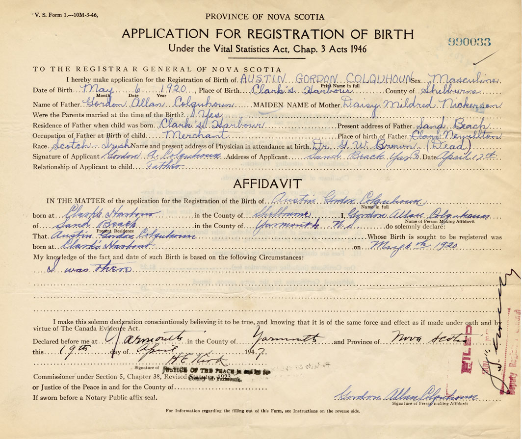 I hereby make application for the Registration of Birth of Austin GordonColquhoun Sex Male