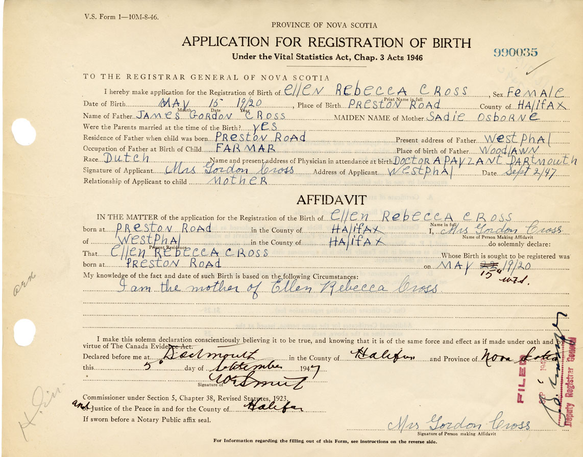 Date of Birth May 15, 1920 Place of Birth Preston RoadCounty of Halifax