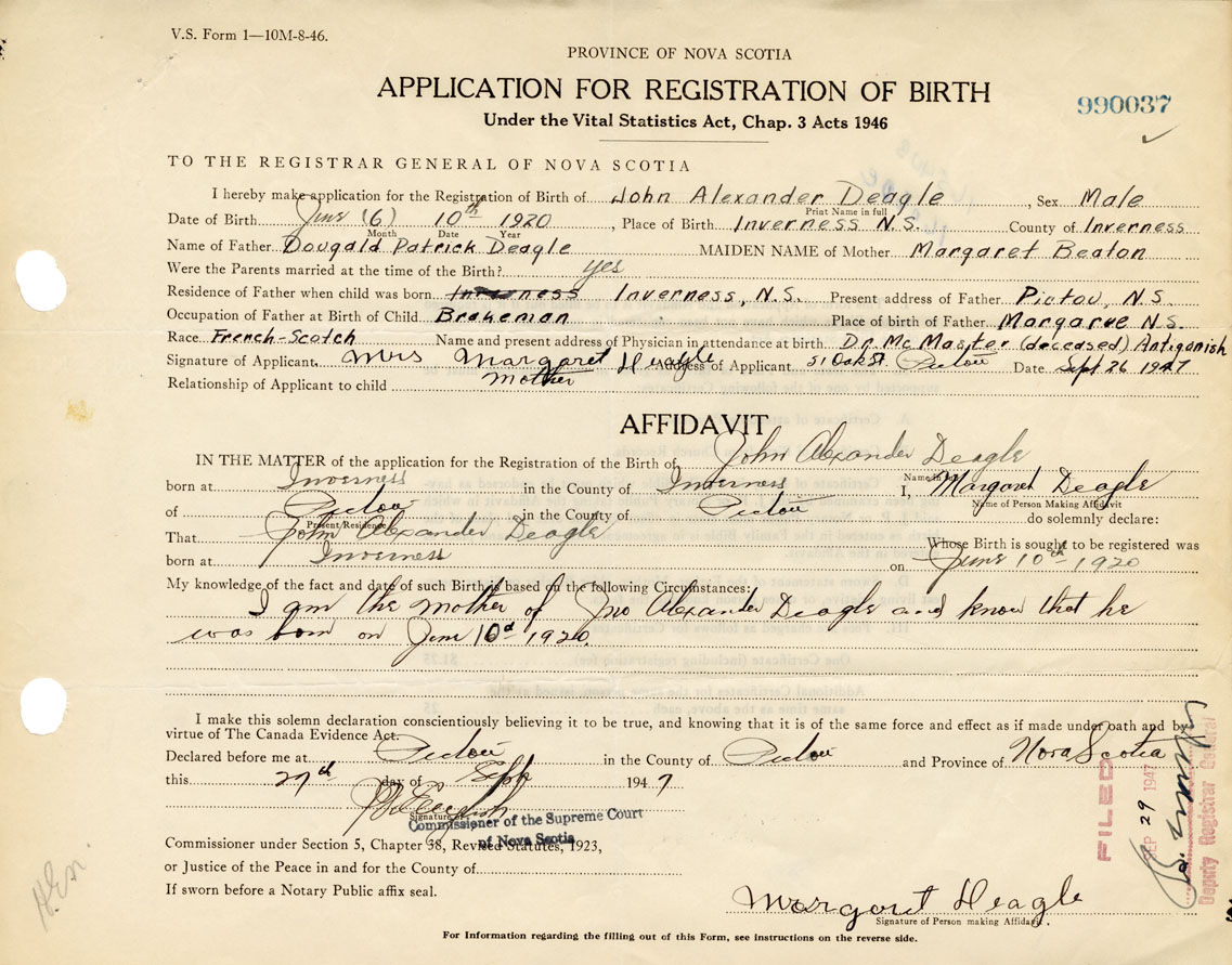 I hereby make application for the Registration of Birth of John AlexanderDeagle Sex Male