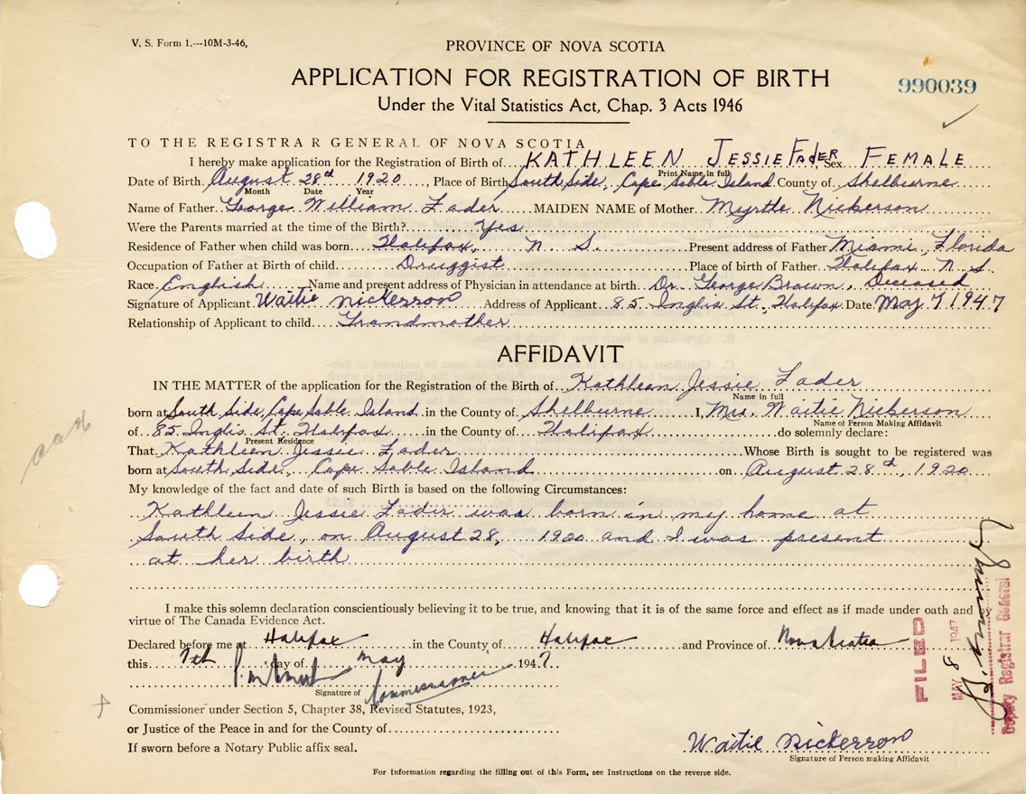 Date of Birth August 28, 1920 Place of Birth South Side Cape Sable IslandCounty of Shelburne