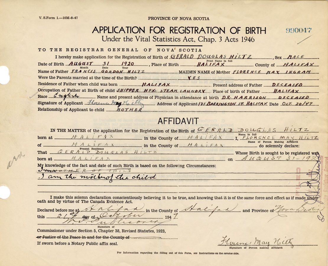 I hereby make application for the Registration of Birth of GeraldDouglas Hiltz Sex Male