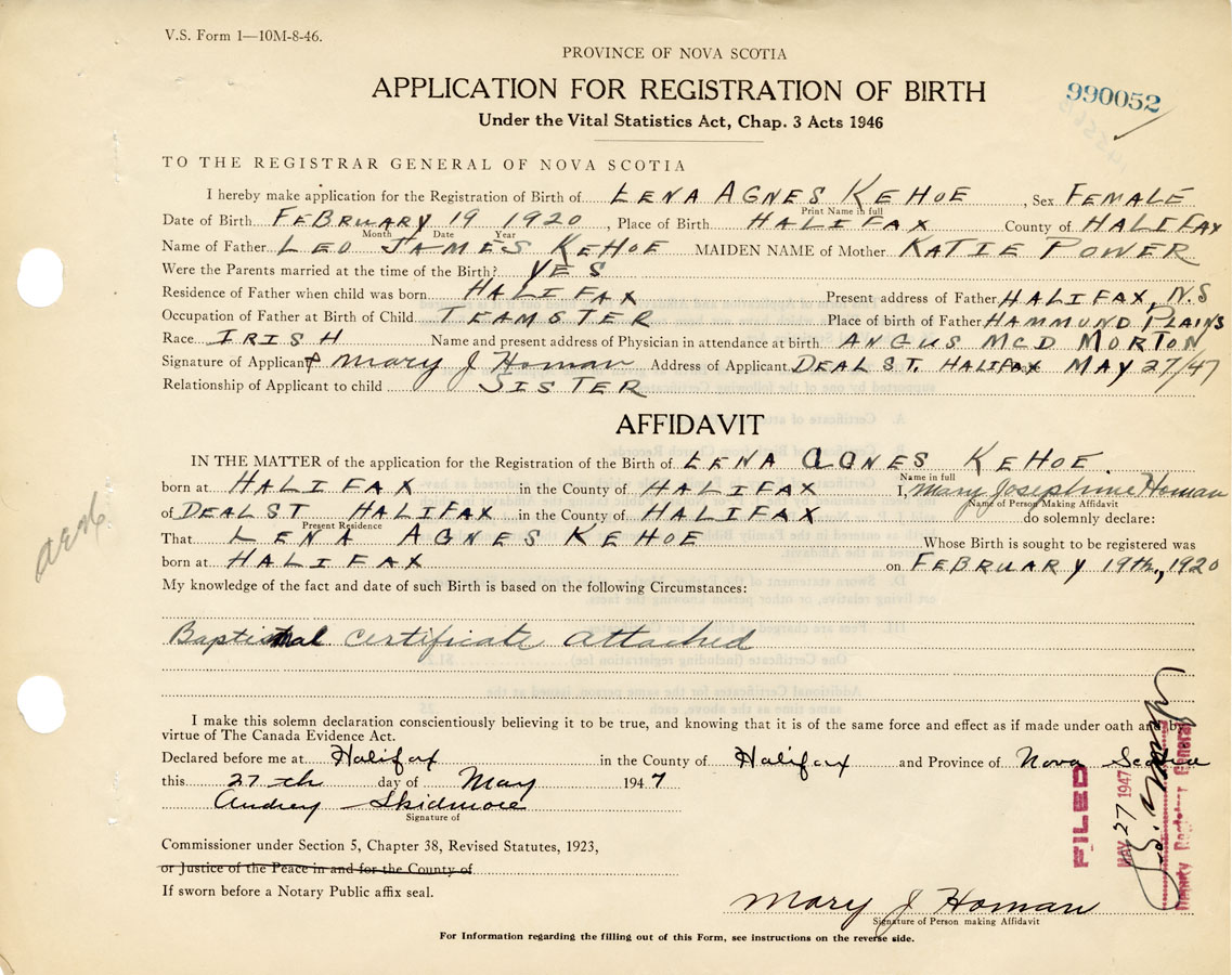 Signature of Applicant Mary J. Harman Address of Applicant Deal St. Halifax Date May 27, 1947