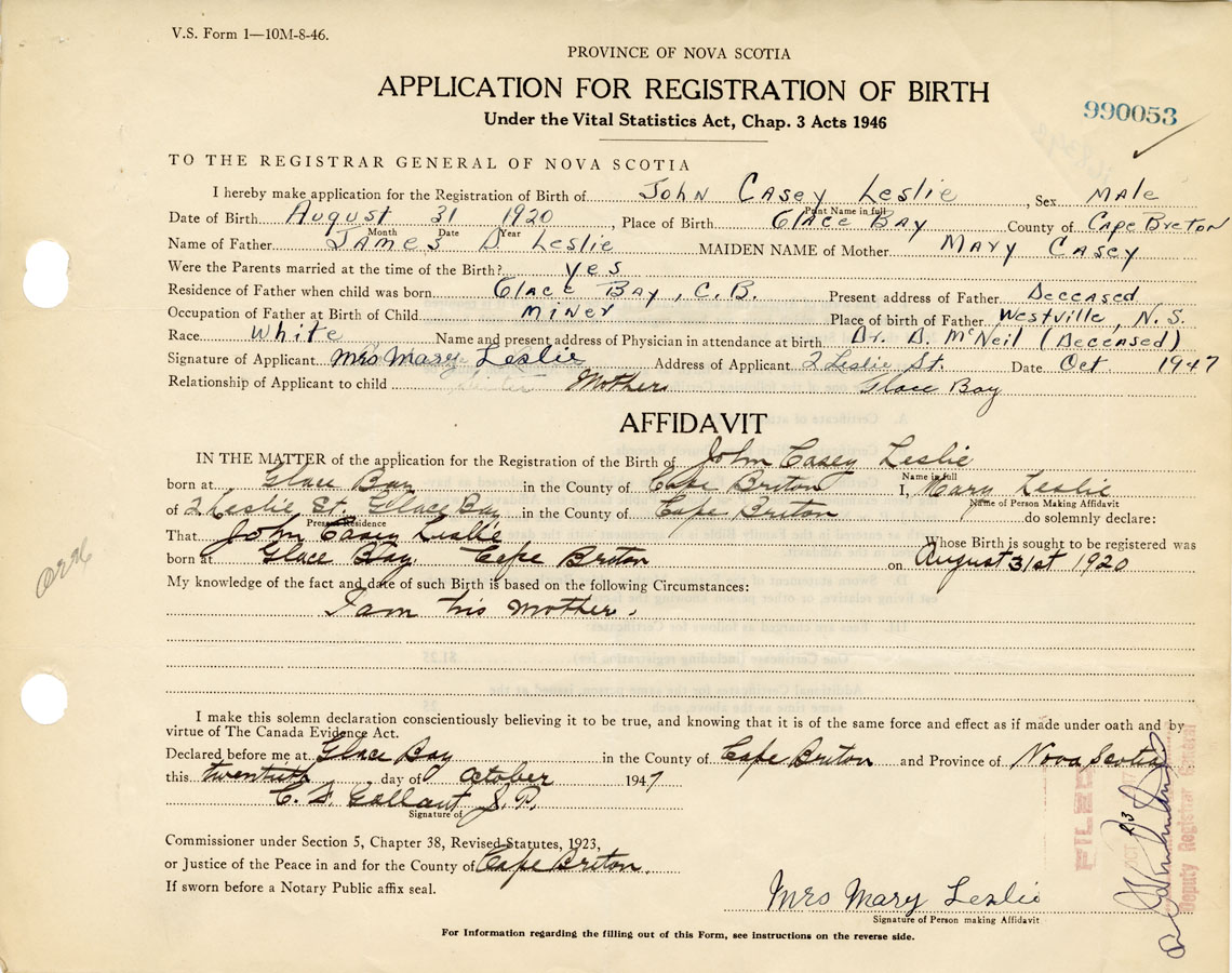 Date of Birth August 31, 1920 Place of Birth Glace BayCounty of Cape Breton