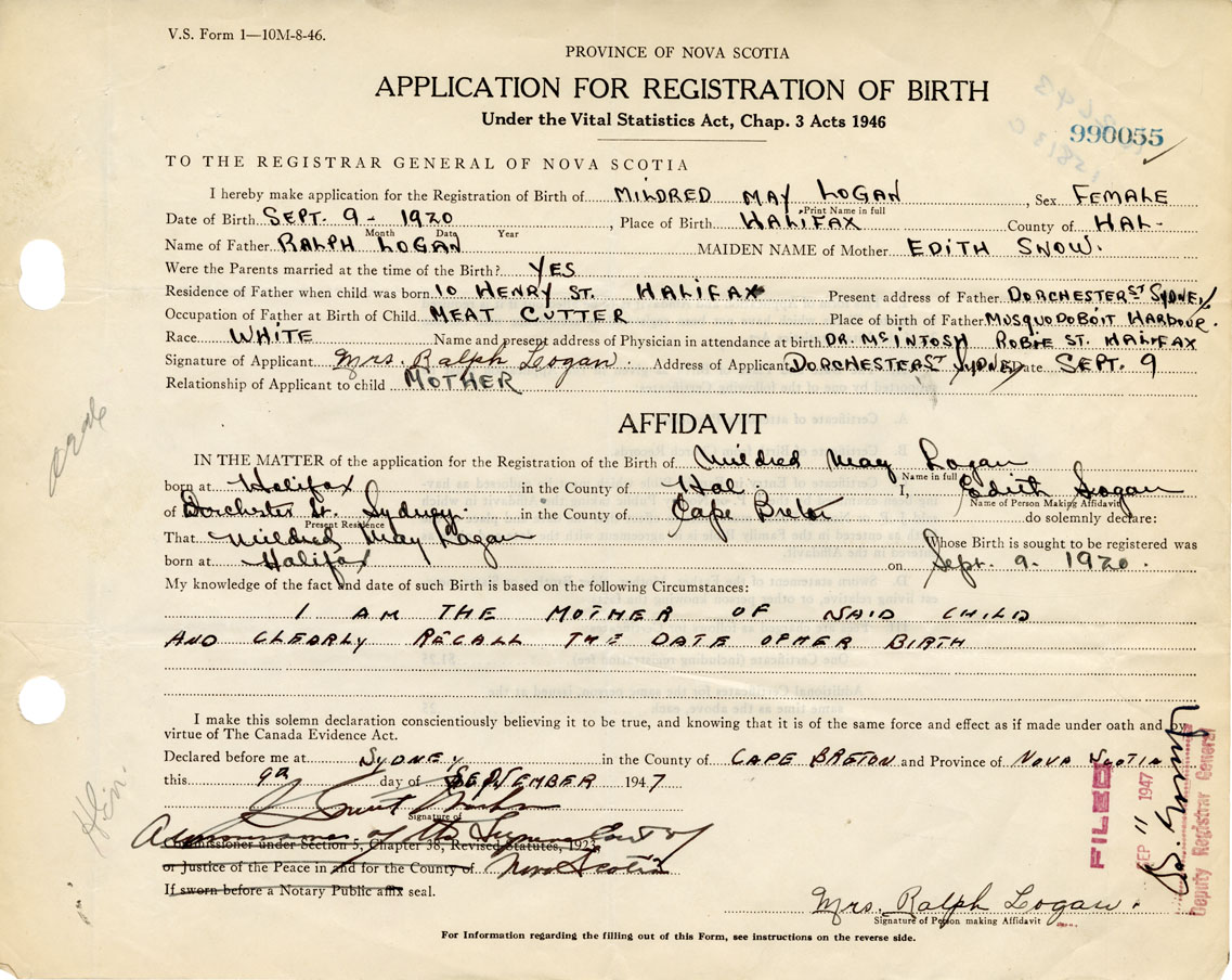 I hereby make application for the Registration of Birth of Mildred MayLogan Sex Female
