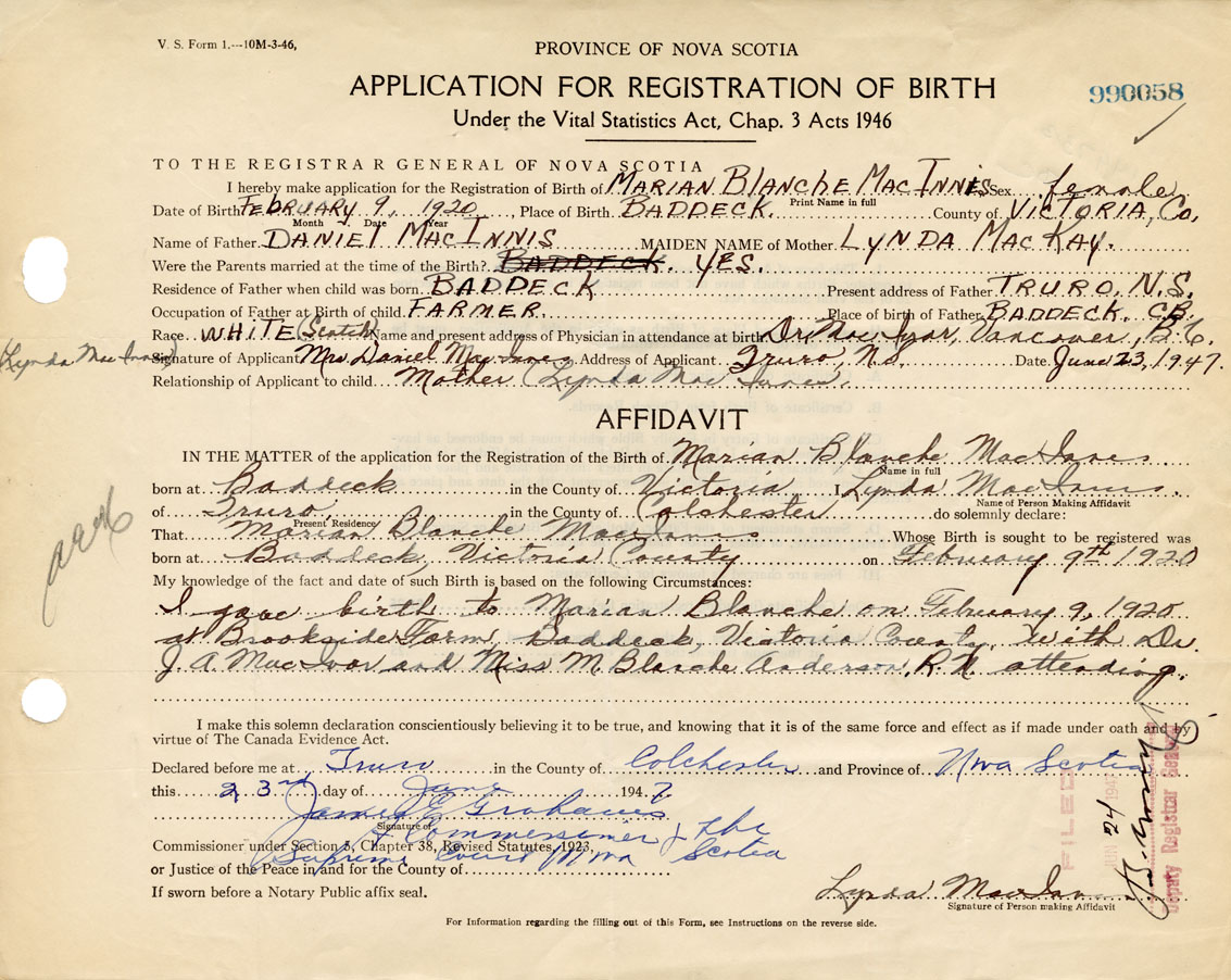 I hereby make application for the Registration of Birth of Marian BlancheMacInnis Sex Female