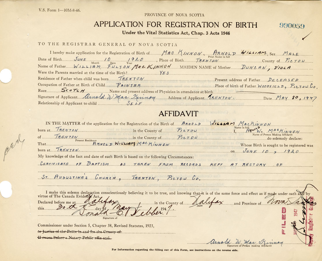 I hereby make application for the Registration of Birth of Arnold WilliamMacKinnon Sex Male