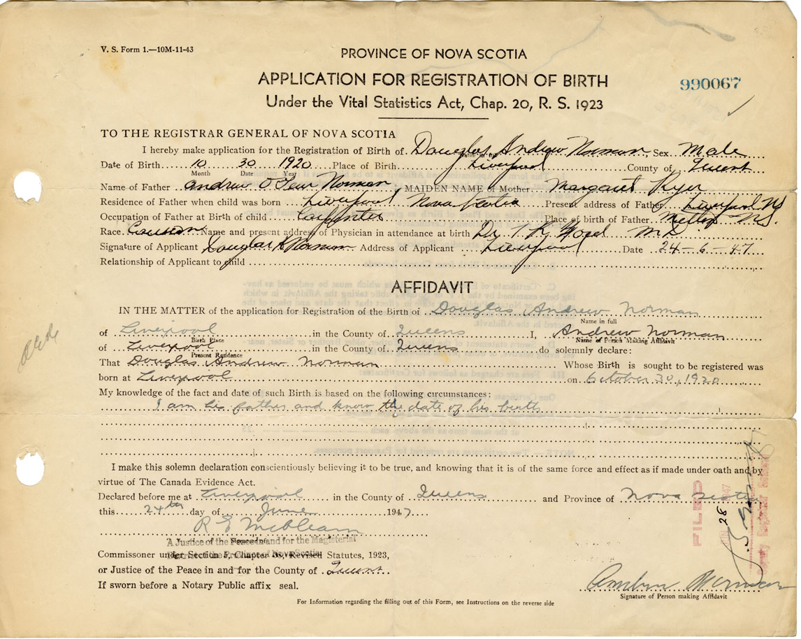 I hereby make application for the Registration of Birth of Douglas AndrewNorman Sex Male