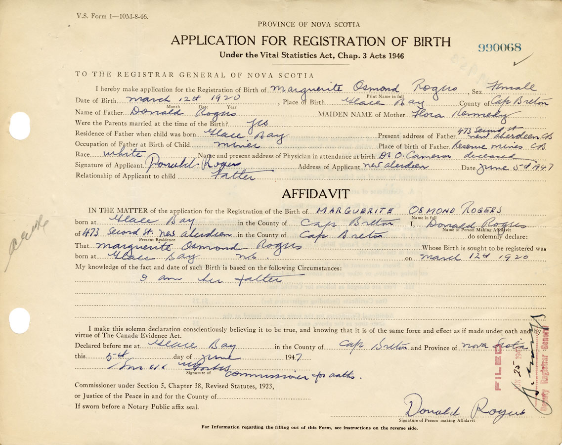 IN THE MATTER of the application for the Registration of the Birth of Marguerite OsmondRogers