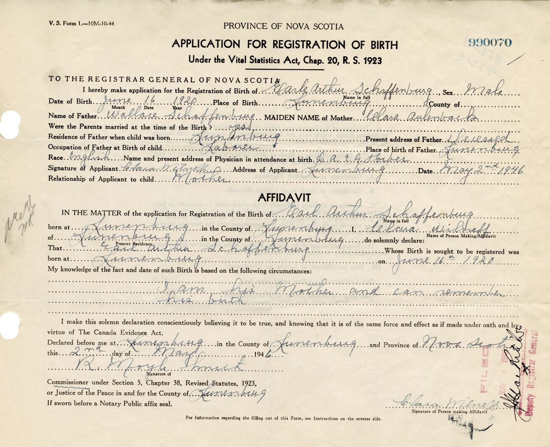 Date of Birth June 16, 1920 Place of Birth LunenburgCounty of Lunenburg