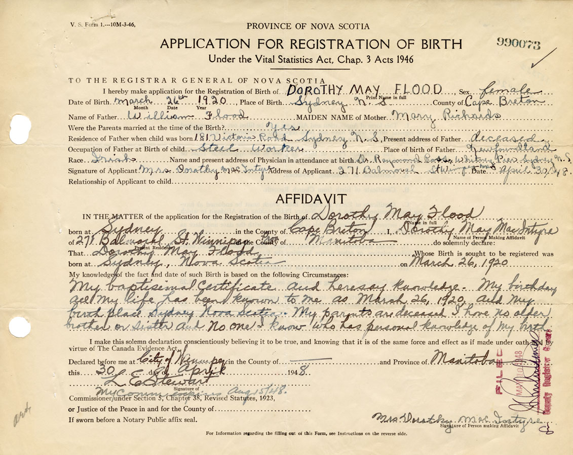 IN THE MATTER of the application for the Registration of the Birth of Dorothy May Flood