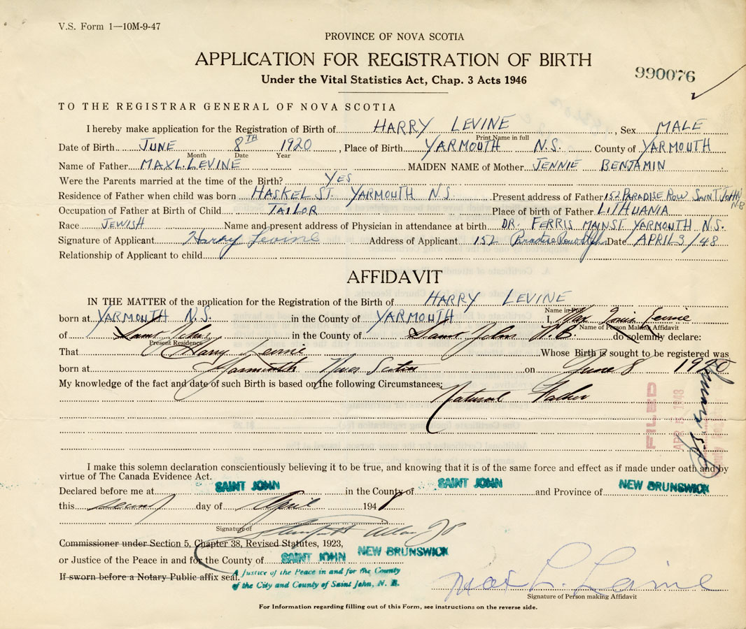 Signature of Applicant Harry Levine Address of Applicant 152 Paradise Row, Saint John, NB Date April 3, 1948