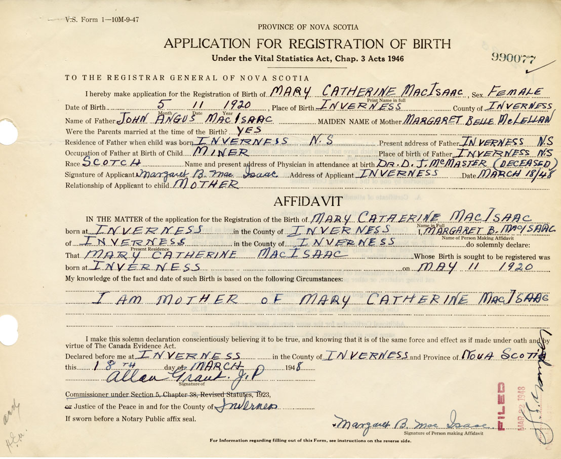 Signature of Applicant Margaret B. MacIsaac Address of Applicant Inverness Date March 18, 1948