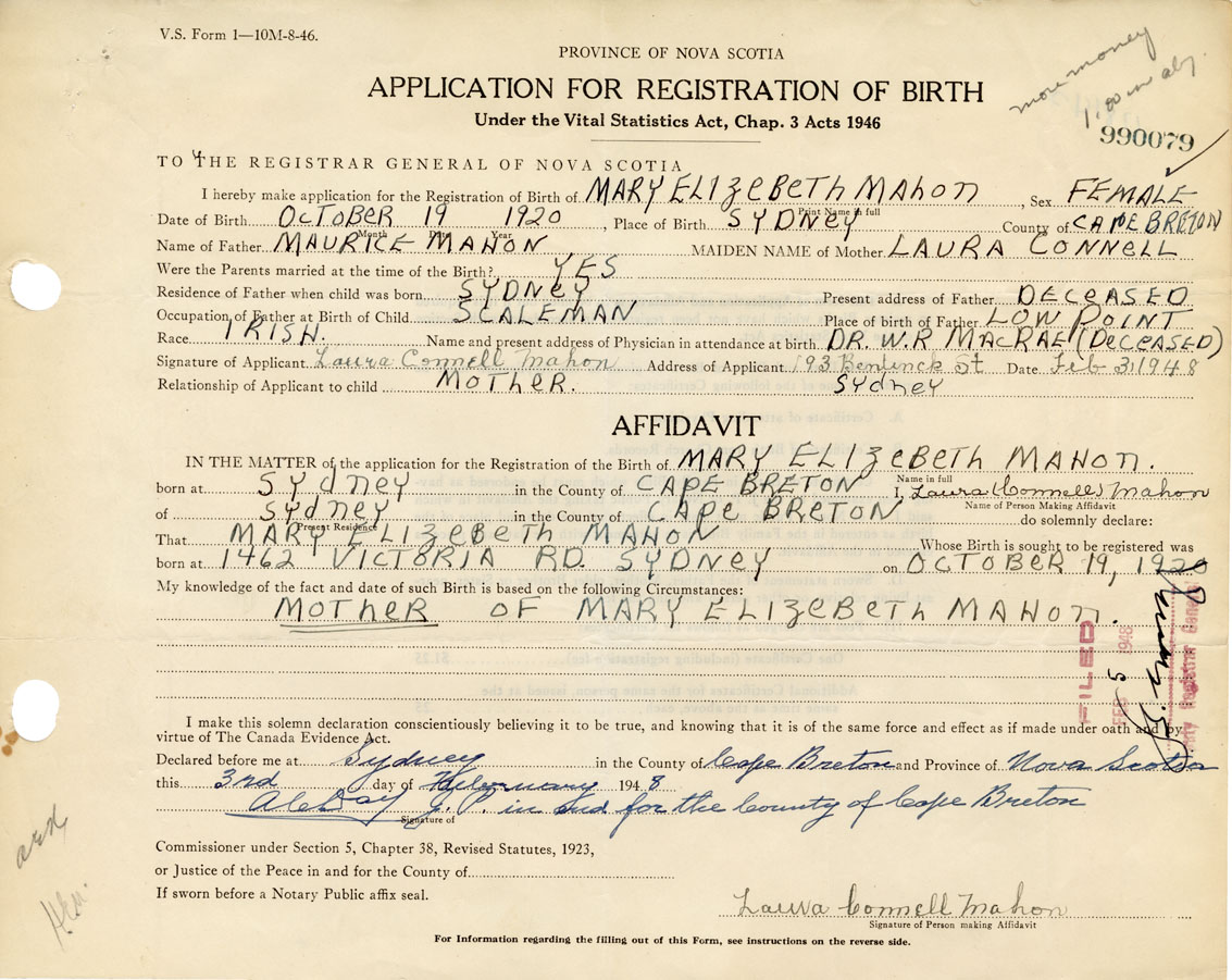 Date of Birth October 19, 1920 Place of Birth SydneyCounty of Cape Breton