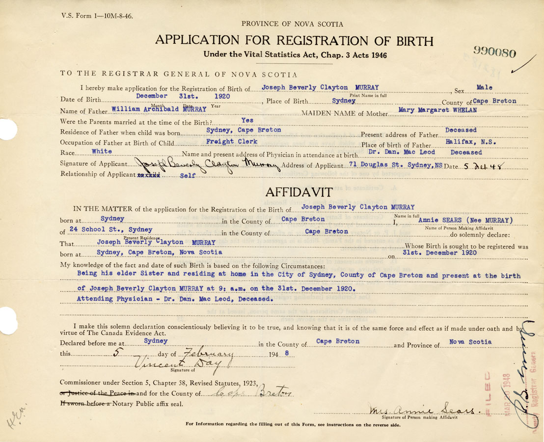 Being his elder Sister and residing at home in the City of Sydney, County of Cape Breton and present at the birth of Joseph Beverly Clayton Murray at 9am on the 31 December 1920. Attending Physician - Dr. Dan MacLeod, Deceased.