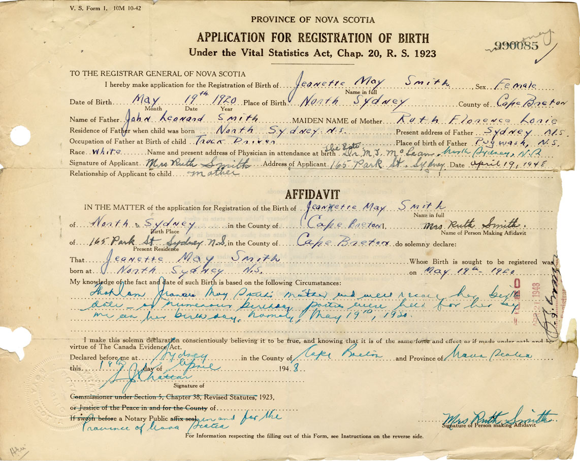 Date of Birth May 19, 1920 Place of Birth North SydneyCounty of Cape Breton