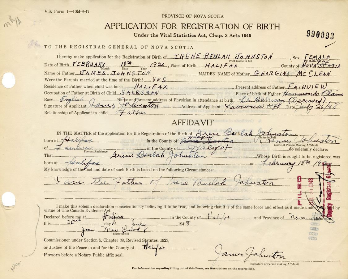 I hereby make application for the Registration of Birth of Irene BeulahJohnston Sex Female