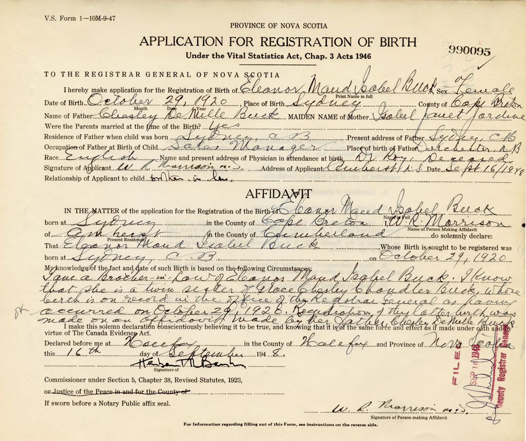 I am a brother-in-law of Eleanor Maud Isabel Buck. I know she is a twin sister of Grace Chesley Chandler Buck, whose birth is on record in the office of the registrar general as having occured on October 29, 1920. Registration of this latter birth was made on an affidavit made by her father, Chesley DeMille Buck.