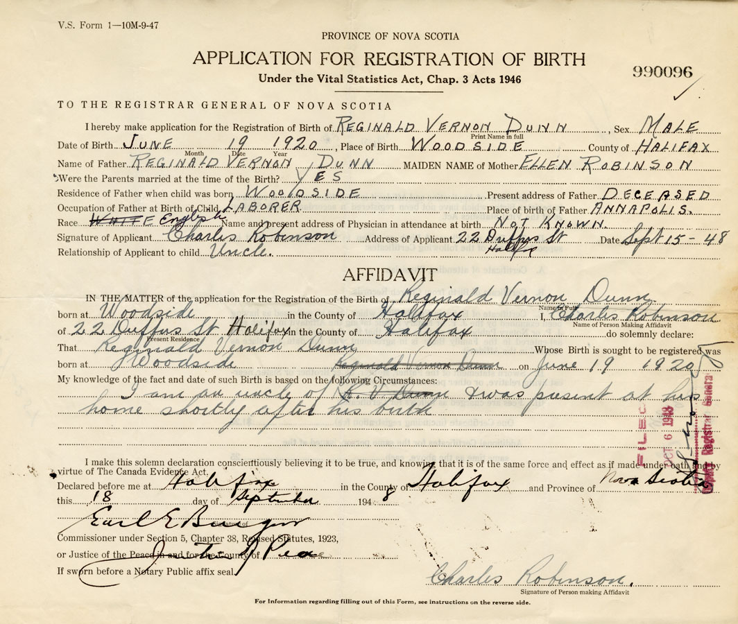 I hereby make application for the Registration of Birth of Reginald VernonDunn Sex Male