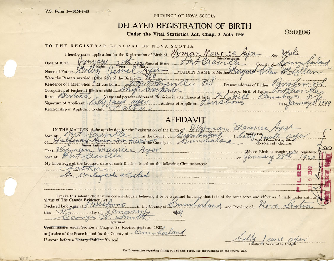 I hereby make application for the Registration of Birth of Wyman MauriceAyer Sex Male