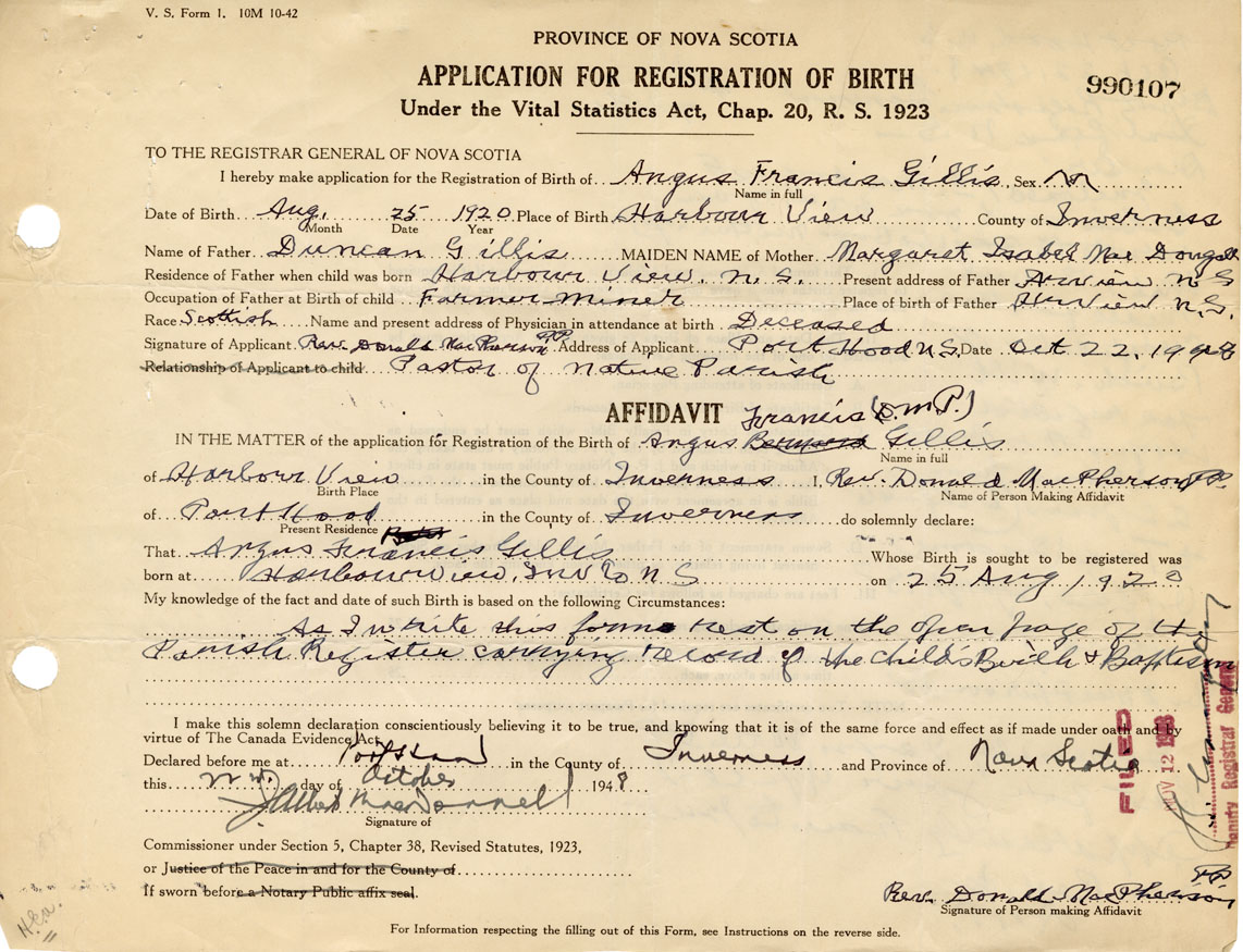 Date of Birth August 25, 1920 Place of Birth Harbour ViewCounty of Inverness