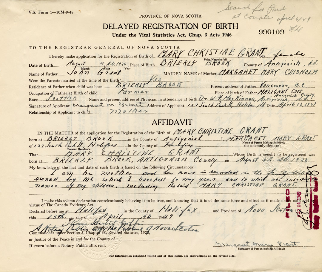 Signature of Applicant Margaret M. Grant Address of Applicant 127 South Park Street, Halifax Date 13 April 1949