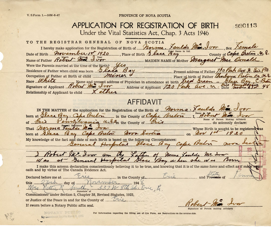 I hereby make application for the Registration of Birth of Norma FauldsMcIvor Sex Female