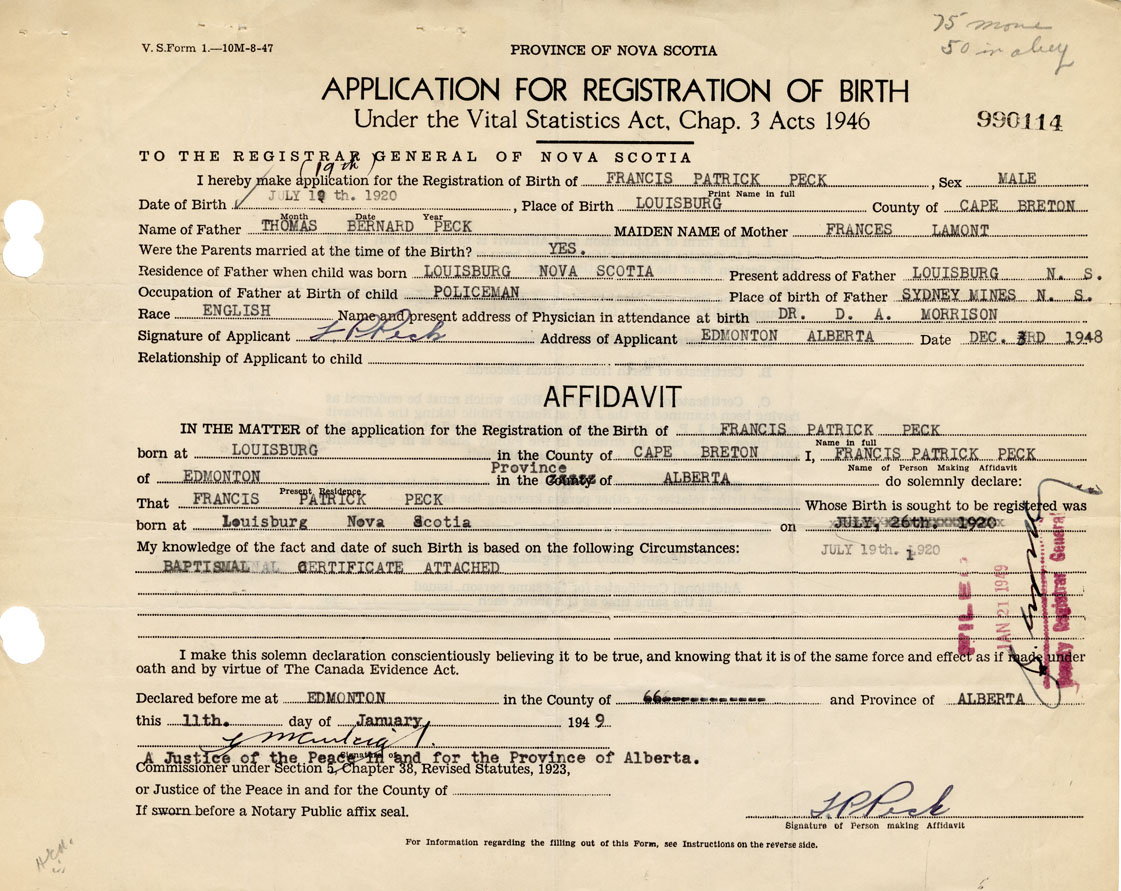 Signature of Applicant F. P. Peck Address of Applicant Edmonton, Alberta Date 3 December 1948