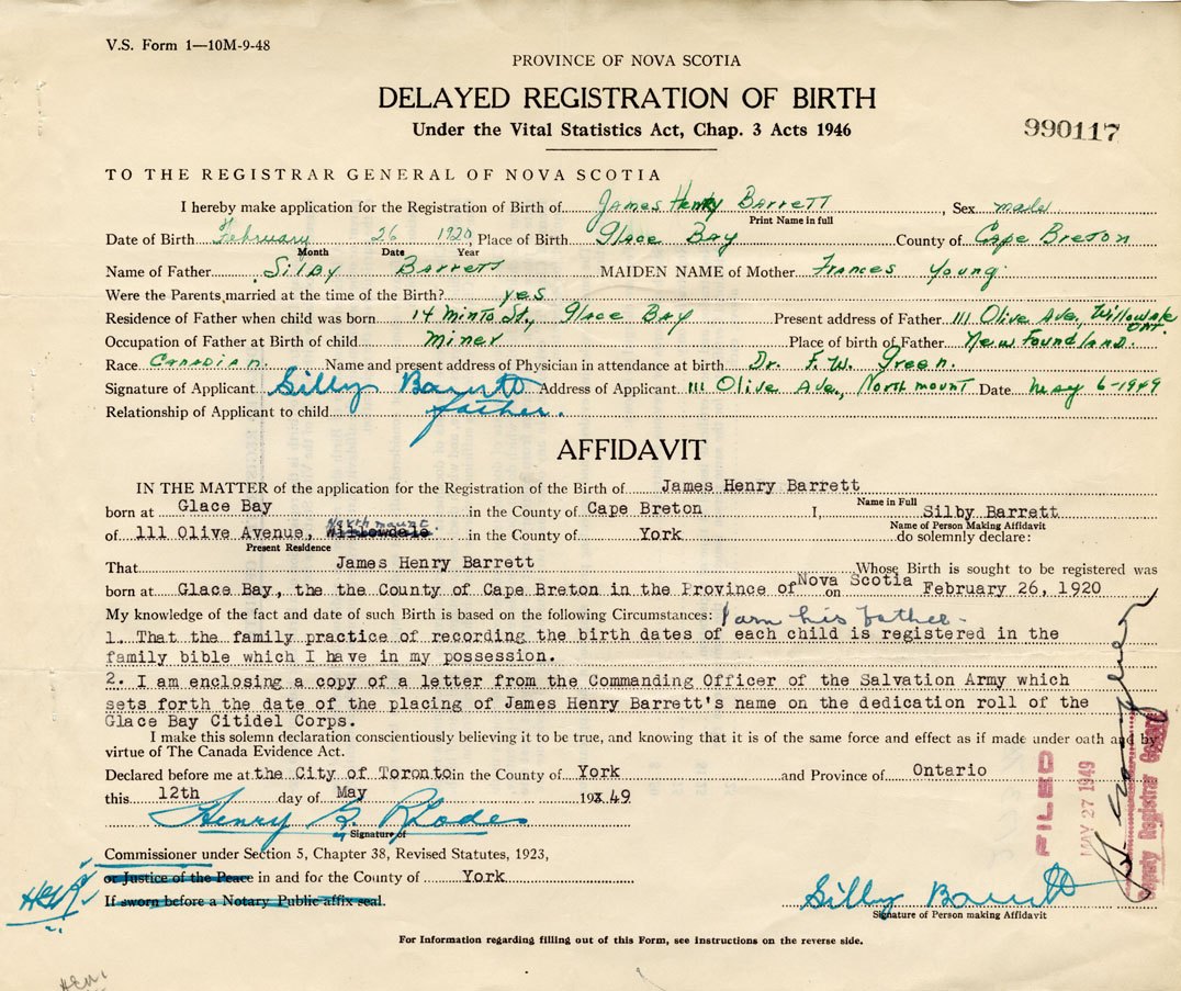 Family practice of recording birth date of each child is registered in family bible in my possession. Copy of letter from the Commanding Officer of the Salvation Army which places James Henry Barrett's name on dedication roll.
