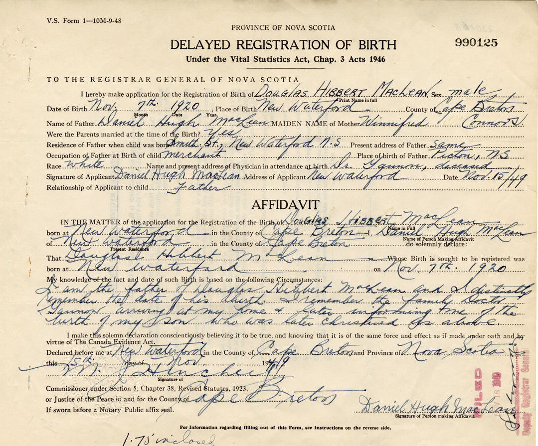 I am the father of Douglas Hibbert MacLean and I distinctly remember the date of his birth. I remember the family Doctor Gammon arriving at my home & later informing me of the birth of my son who was later christened as above.